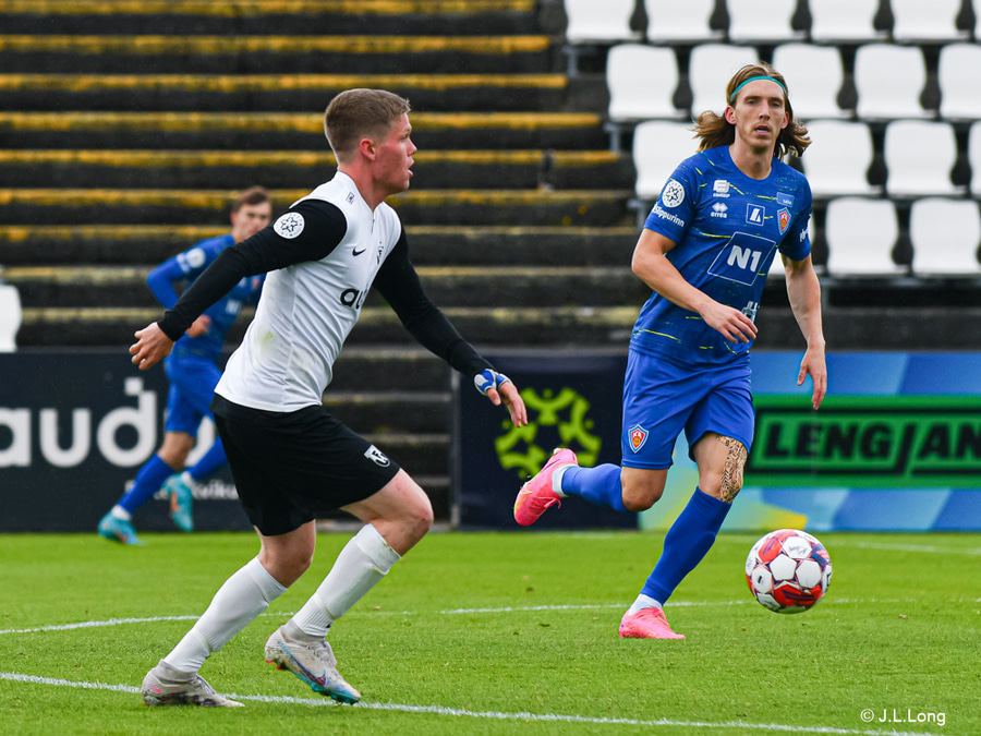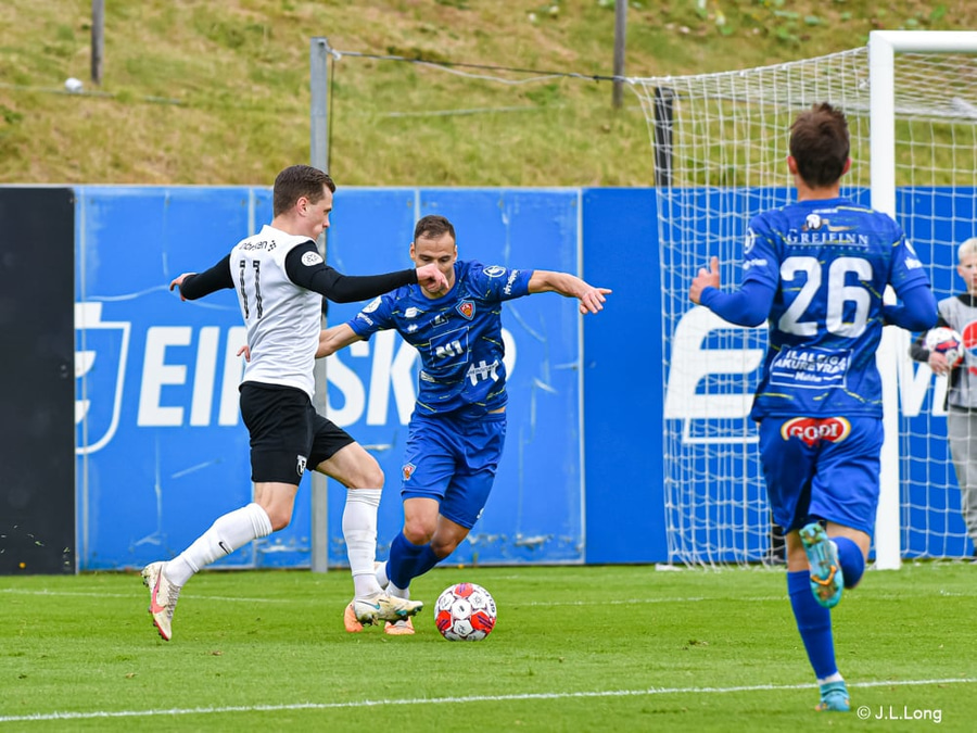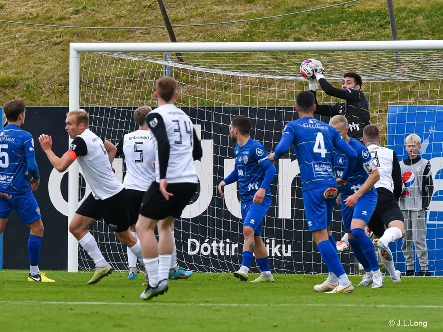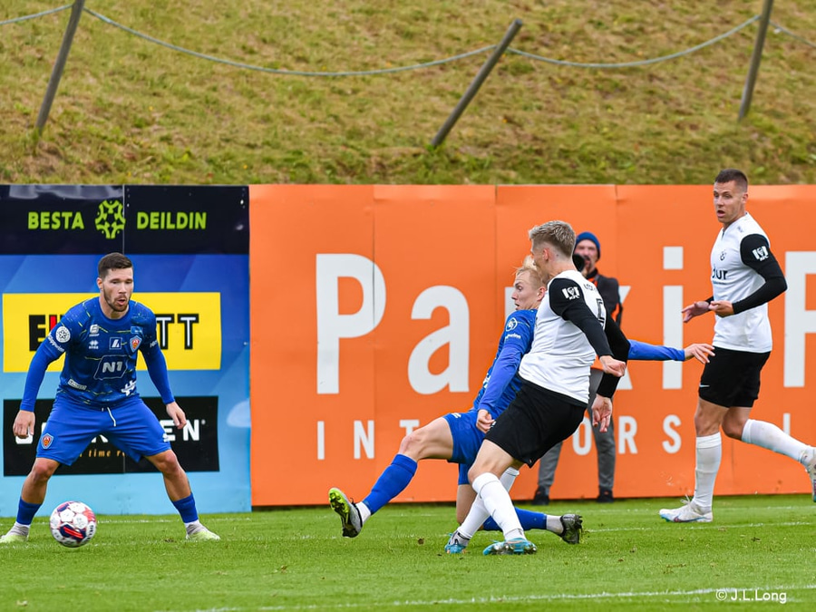 Davíð Snær fær boltann út til hægri og gerir allt rétt. Rennir boltanum inn á teiginn á Gyrði sem nær ekki nógu góðu skoti og boltinn beint á Jajalo.