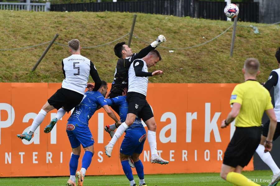 Fær boltann skoppandi til sín og lætur vða en Jajalo ver í hornspyrnu.