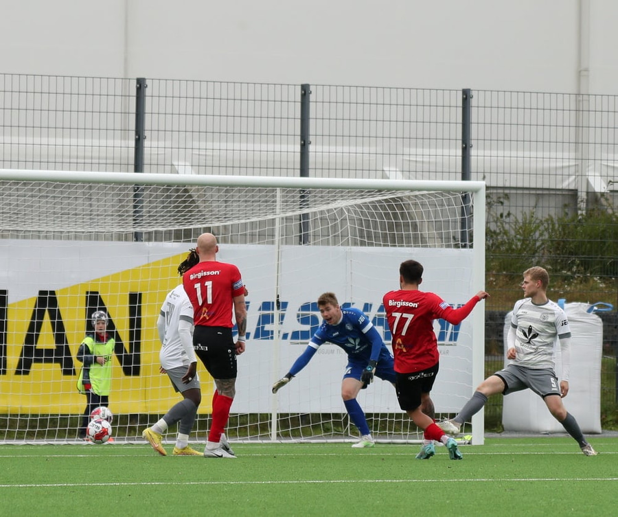 Andri Freyr fær boltann í teignum og battar hann út á Elmar Kára sem leggur boltann örugglega í hornið!