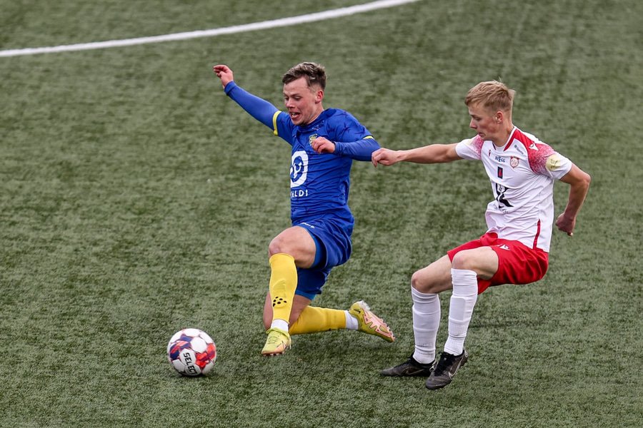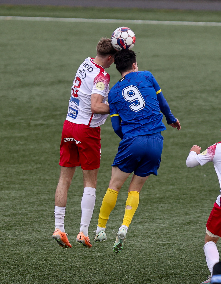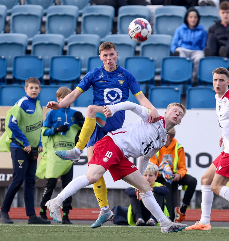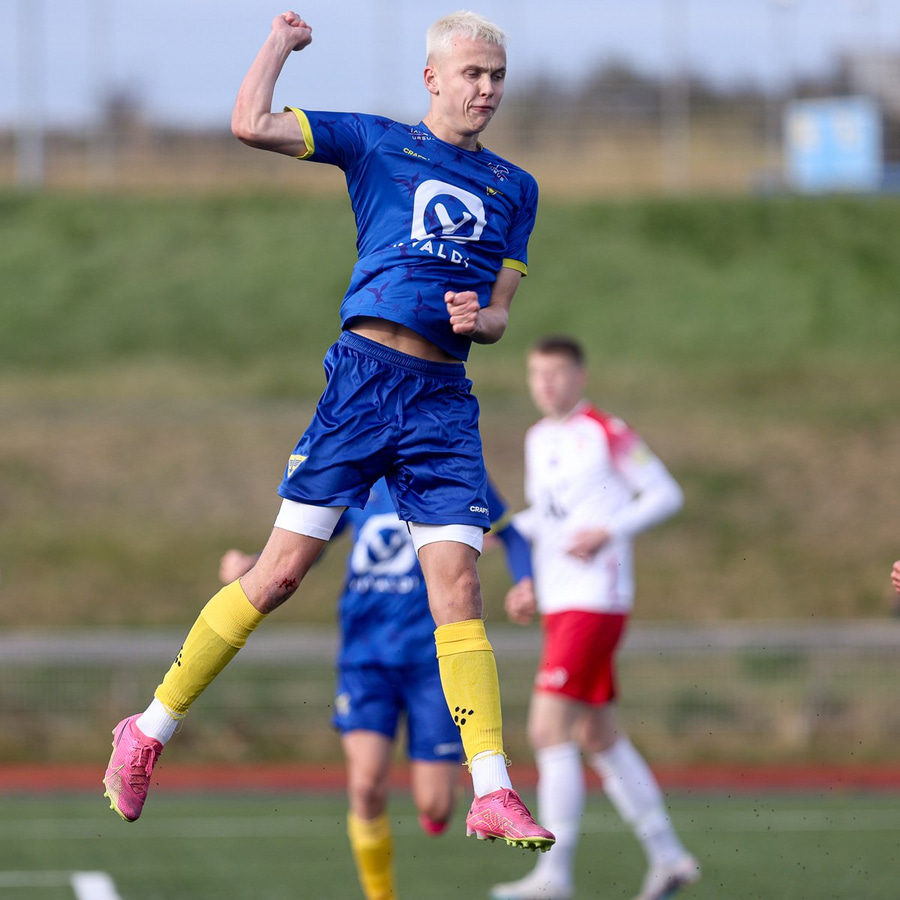 Kristófer Orri með geggjaða sendingu inn fyrir á Tómas Johannessen sem er aleinn gegn Aroni Birki en Aroni les Tómas eins og opna bók.