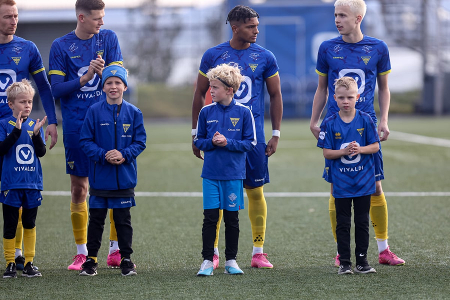 Vilhjálmur Alvar leiðir liðin til leiks og vallarþulur Gróttumanna byrjar að kynna liðin.