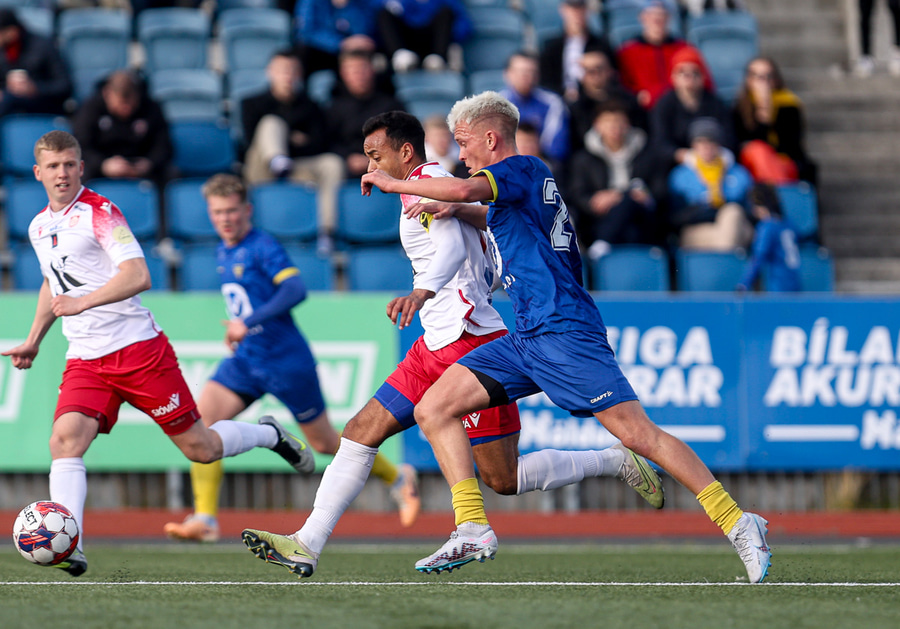 Þórsarar lyfta boltanum inn fyrir á Bjarna Guðjón. Rafal keyrir út í Bjarna sem fellur en Villi dæmir ekkert.