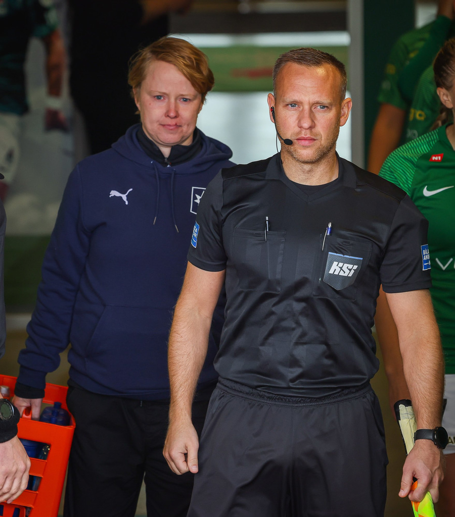 Katrín þræðir boltanum í gegn á Linli Tu en flaggið fer á loft. Linli keyrir af fullum krafti á Erin sem er komin vel út úr markinu.