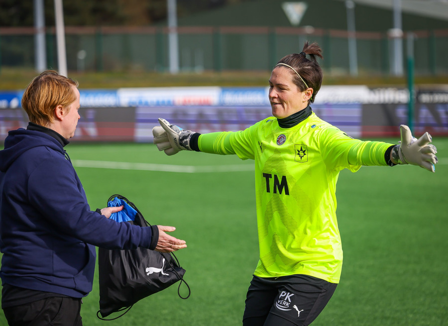 Andrea Mist reynir að lyfta boltann inn á teig í hlaupið hjá Gunnhildi Yrsu en Toni nær að koma tánni í boltann og hann endar í fanginu á Telmu.