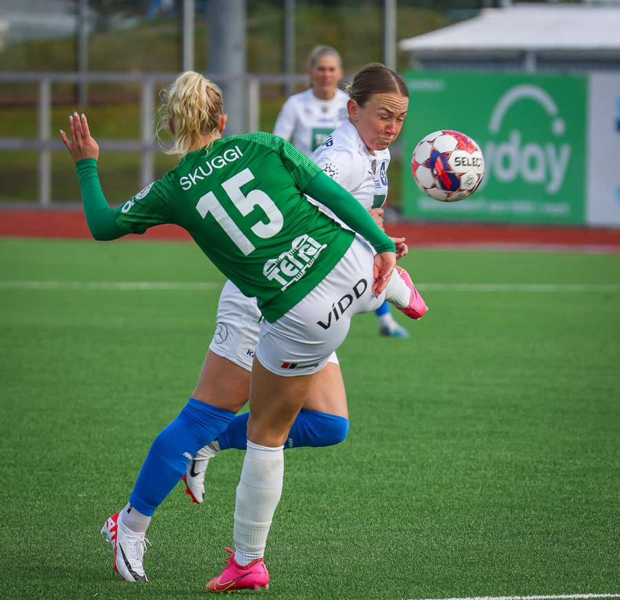 Arna Dís og Vigdís Lilja lenda hér í slæmum árekstri. Langur bolti frá Telmu og þær eru báðar að horfa áboltann en Arna Dís keyrir Vigdísi hressilega niður. Vigdís steinliggur og fær aðhlynningu.