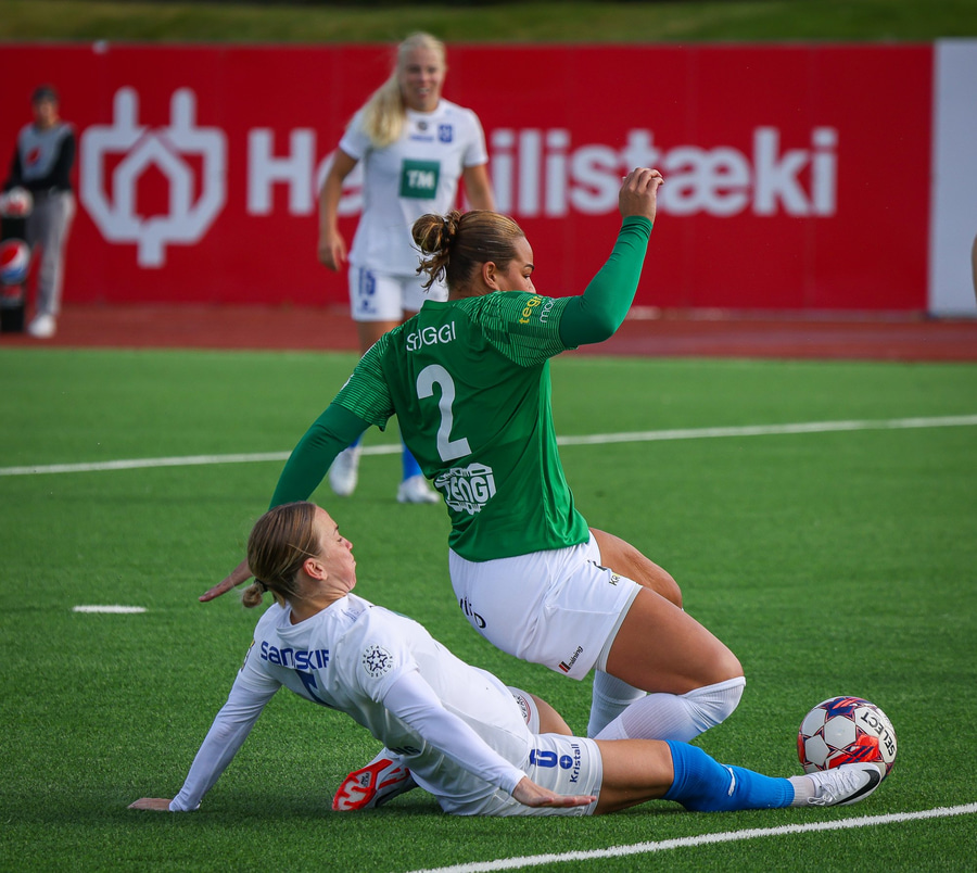 Sædís setur boltann inn á miðjan teiginn og Hulda Hrund nær skoti á markið sem Telma ver vel í horn. Þetta var dauðafæri!