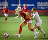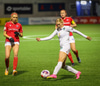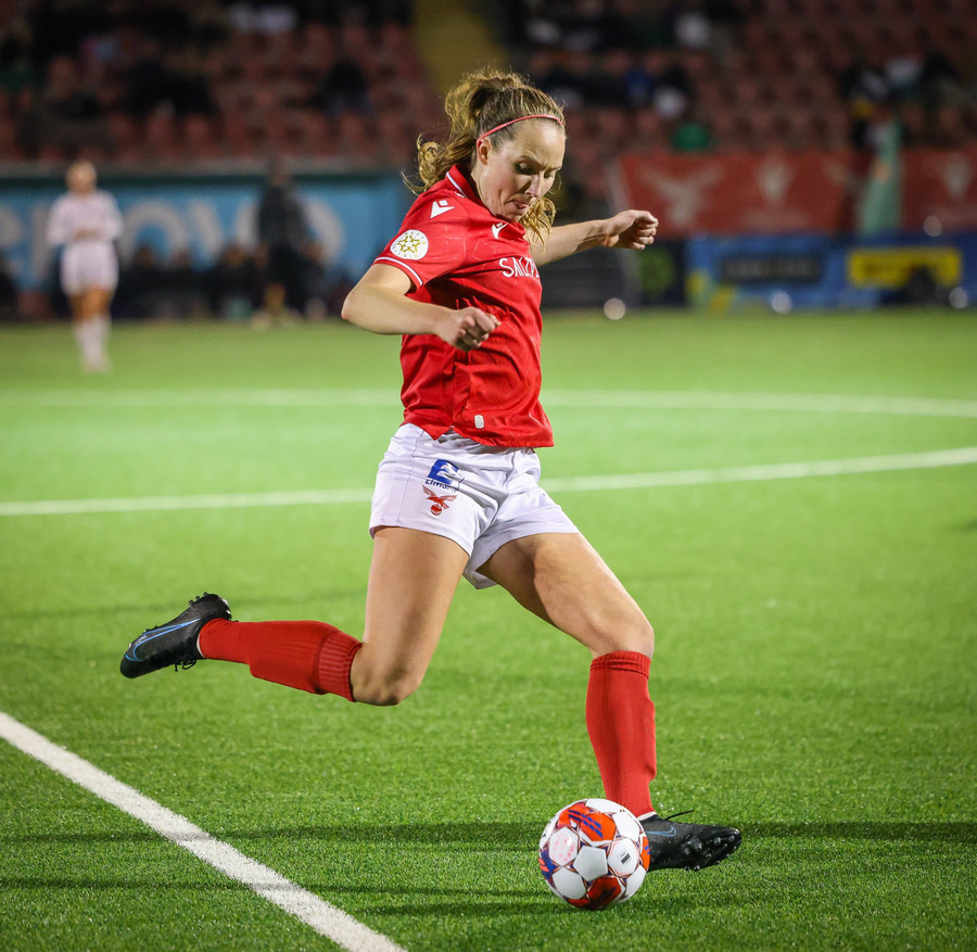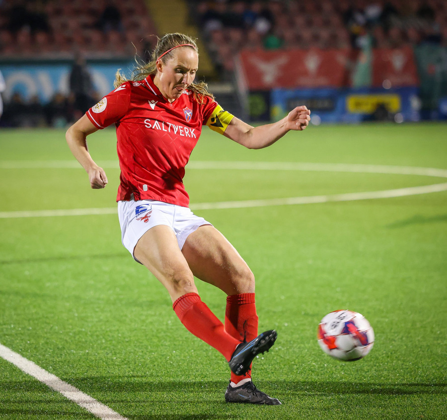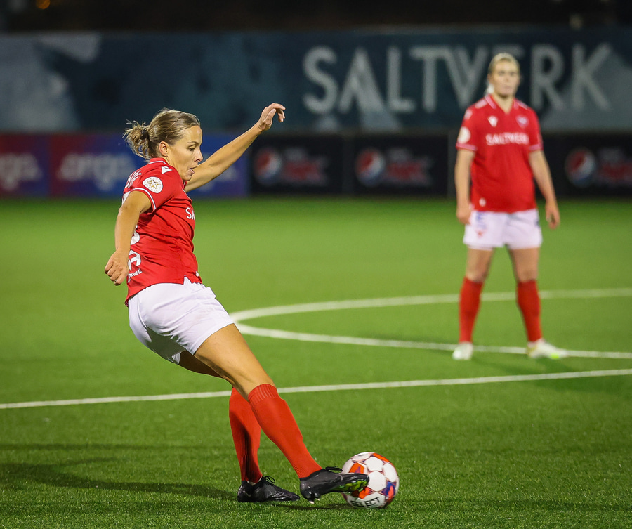Amanda tekur spyrnuna á nær. Þar er Arna Sif mætt í baráttuna og reynir að troða boltanum inn fyrir línuna en setur hann yfir markið.