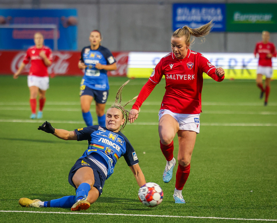 Málfríður með geggjaðan bolta inn fyrir en Jennifer Klein rétt nær til boltans áður en hann ratar í hættusvæðið.