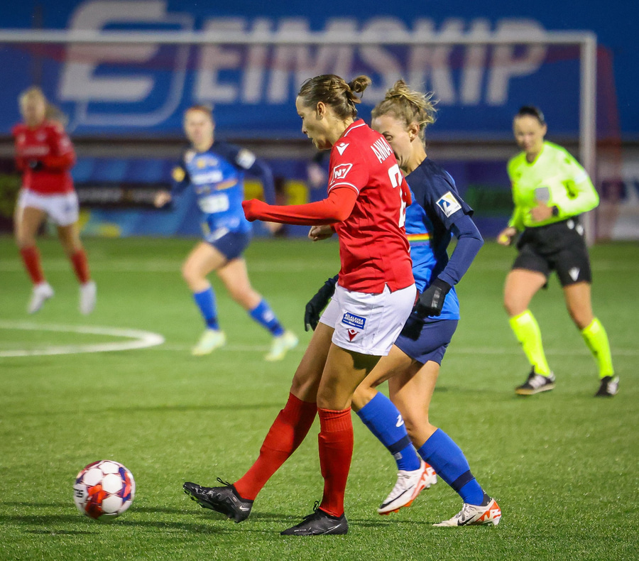 Sarah Mattner fær sendingu inn fyrir en Fanney er vel á verði og er á undan í boltann.