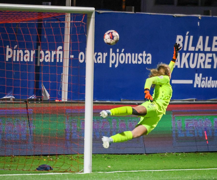 Valentina með boltann eiginlega á sama stað og Rita áðan og setur hann á sama stað í markinu nema aðeins neðar. Fanney nær fingrunum í boltann en það er ekki nóg.
