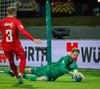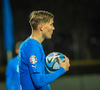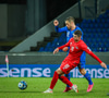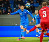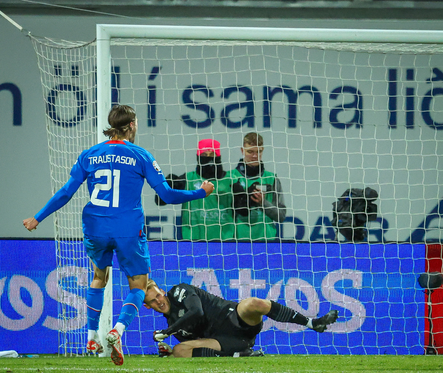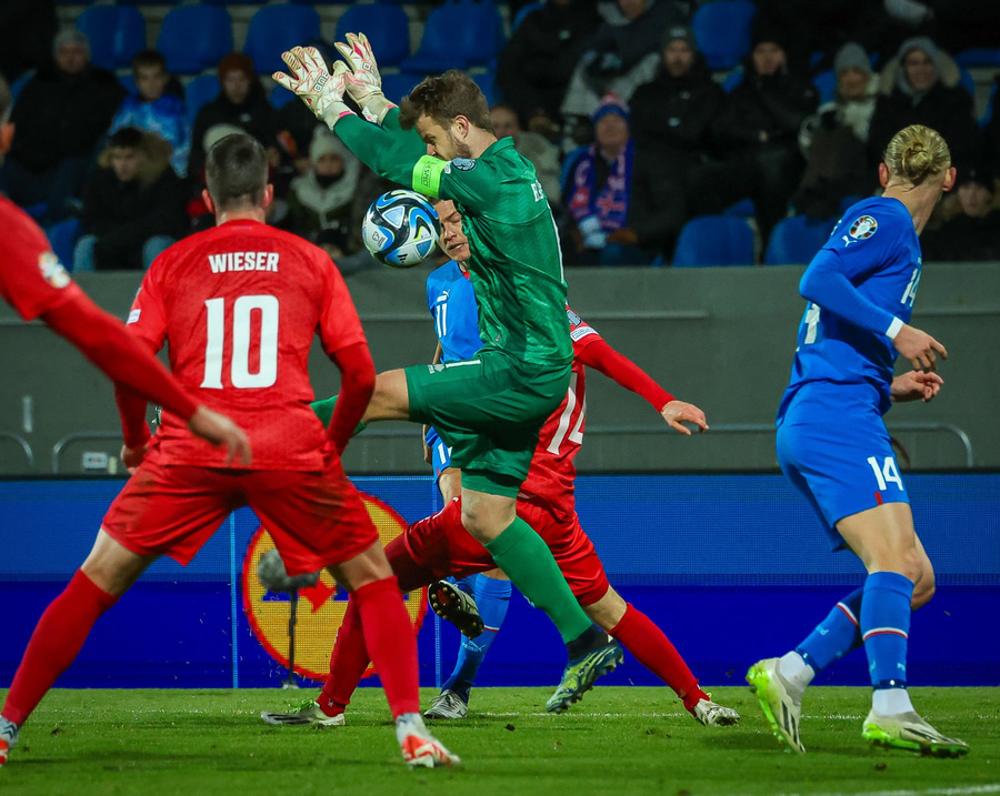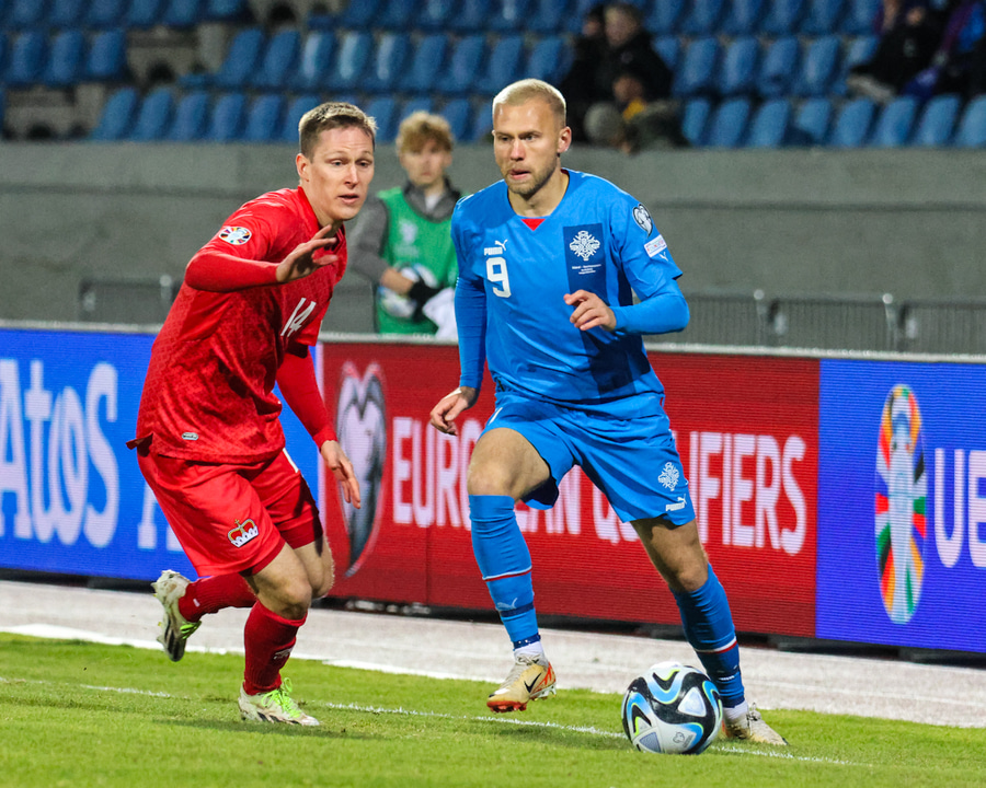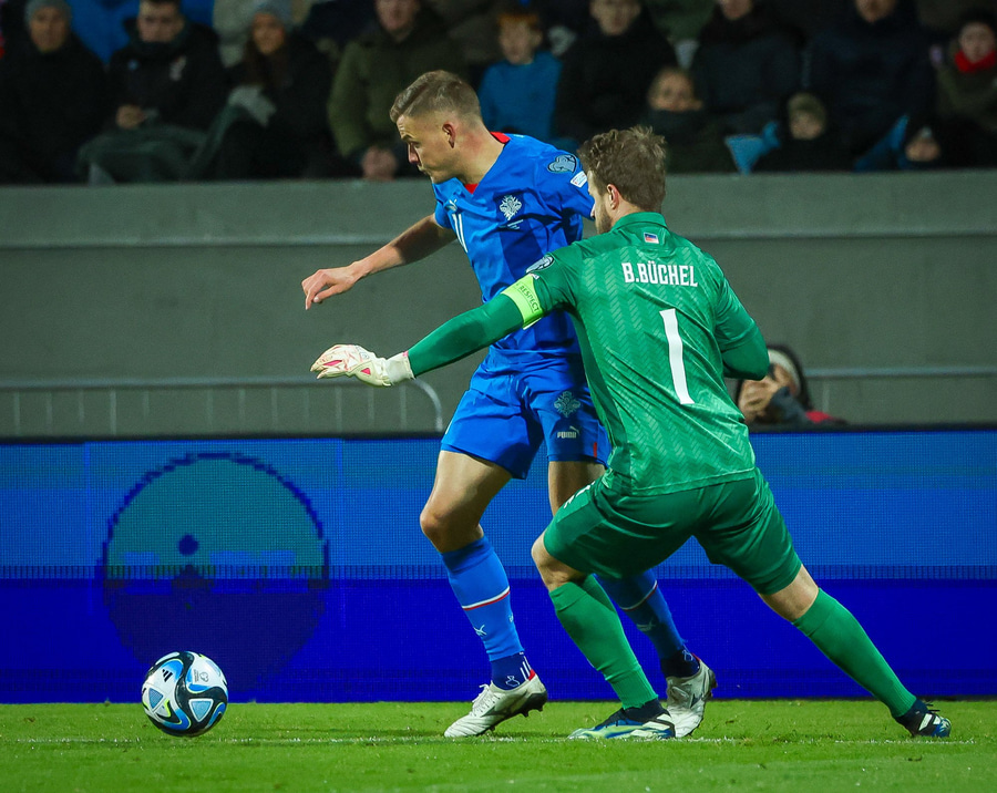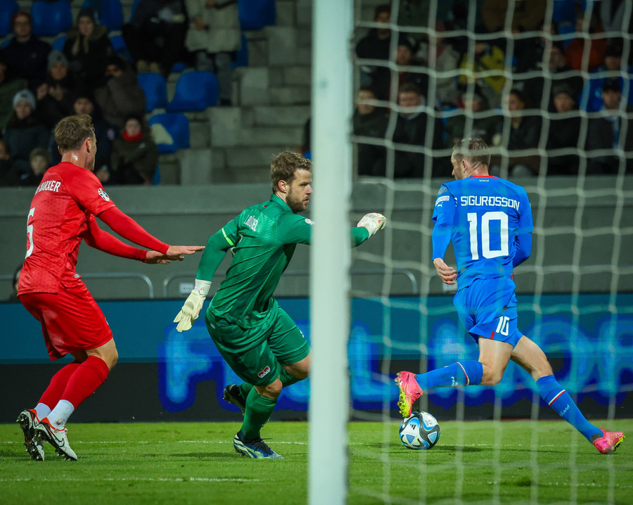 Jón Dagur nær frákastinu en skotið hans beint í fangið á Benjamin Buchel.