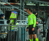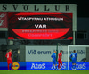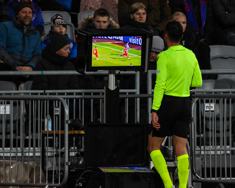 kallað á eftir hendi og dómarinn stöðvar leikinn og fer fer í skjáinn.