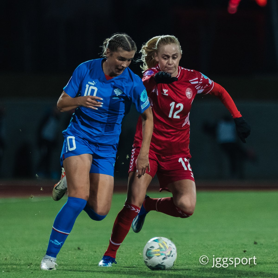 Góð sókn Íslands. Karólína setur boltann upp i hornið hægra megin á Hlín. Hún snýr laglega af sér Katrine Veje og með tíma og pláss til að setja boltann fyrir markið. Fyrirgjöfin góð en vantar íslenskar treyjur til að ráðast á boltann sem siglir fram hjá stönginni fjær.