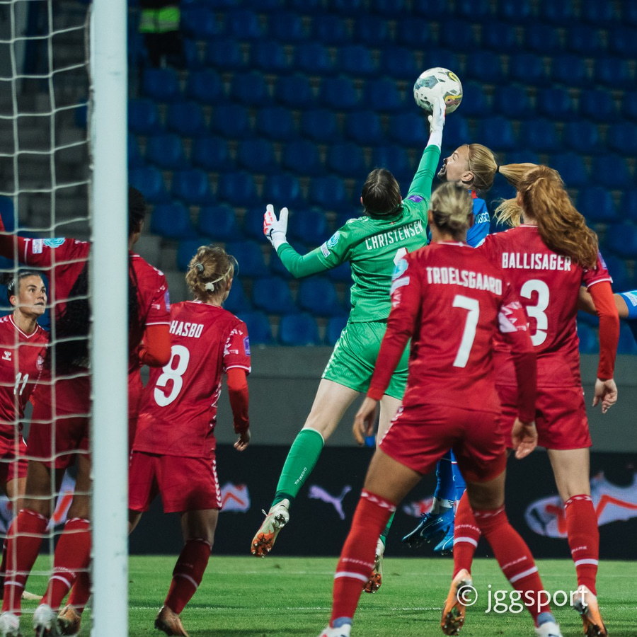 Spyrnan frá Mille Gejl léleg og beint í vegginn, frákastið er danskt en seinna skotið sömuleiðis lélegt og fer afturfyrir.