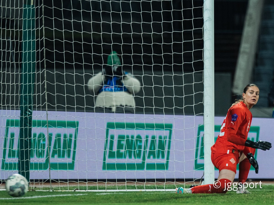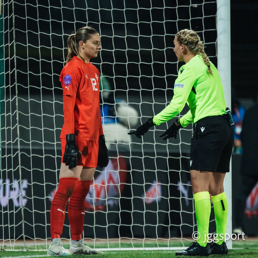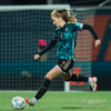 Sara Dabritz tekur spyrnuna og setur boltann framhjá markinu.