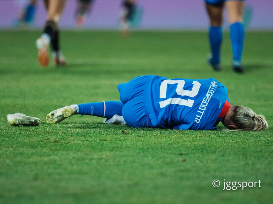 Hafrún Rakel liggur eftir og leikurinn er stöðvaður.