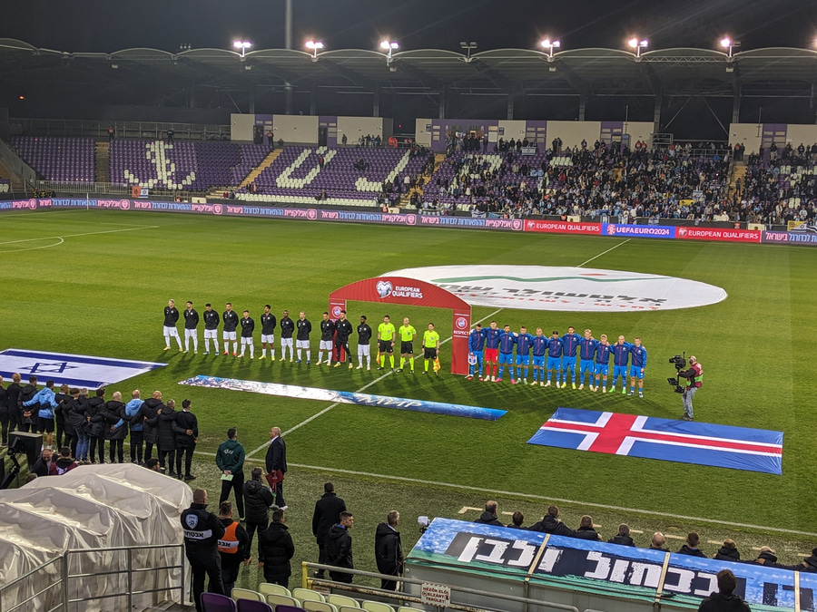 Við höfum haldið boltanum betur þessar fyrstu mínútur Ísraelum í stúkunni til lítillar gleði sem baula í hvert sinn sem við vinnum boltann.