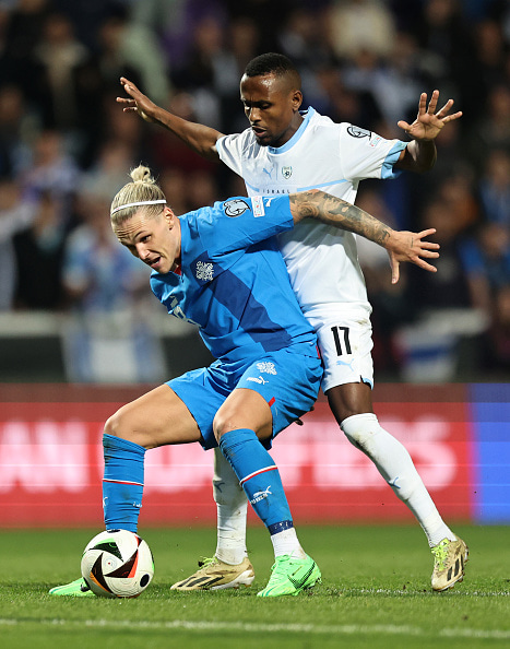 Hornspyrnan léleg en Ísrael vinnur boltann strax aftur. Boltinn fyrir markið frá vinstri þar sem Hákon mætir út en lendir í samstuði við Vitor og missir boltann.