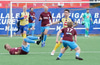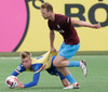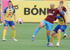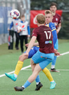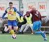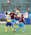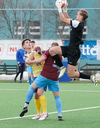 Aukaspyrnan verður að engu þegar að Marc McAusland skallar yfir markið.