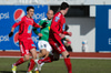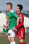 Jóhann truflar Gunnleif þegar hann ætlar að koma boltanum í leik.