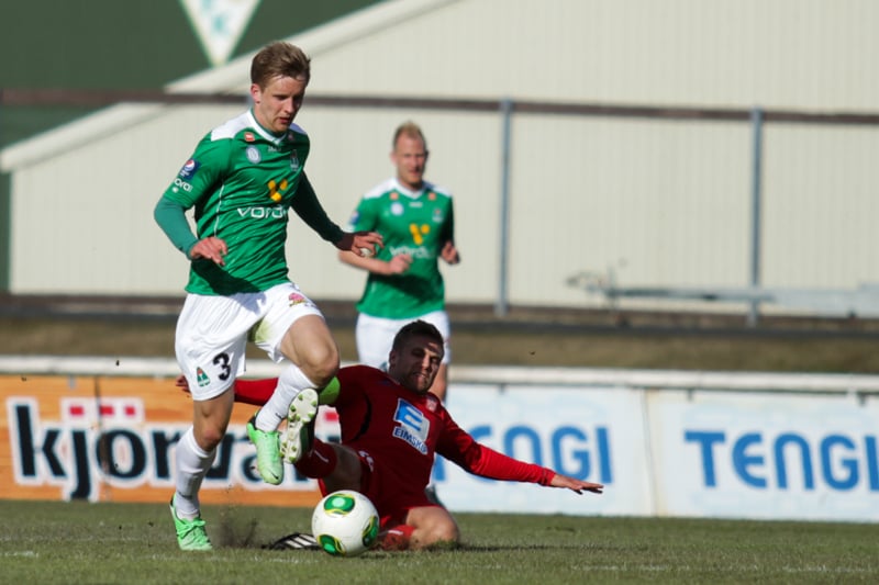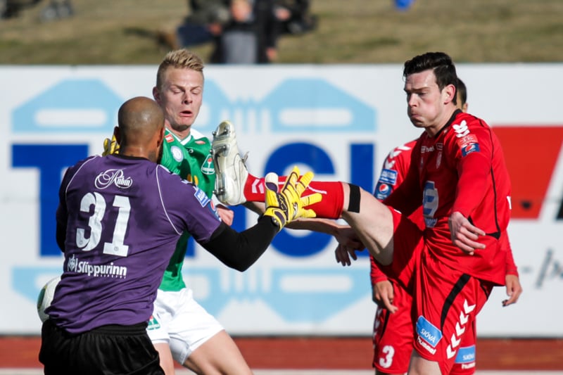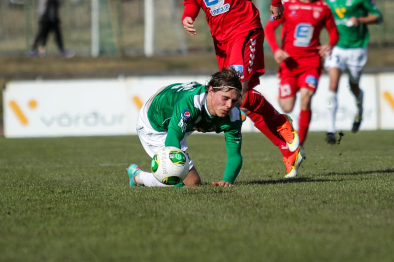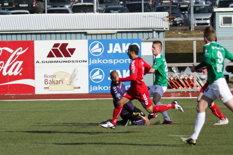 Daninn alltof seinn og fer aftan í Andra Rafn Yeoman sem er á harðaspretti upp hægri kantinn.