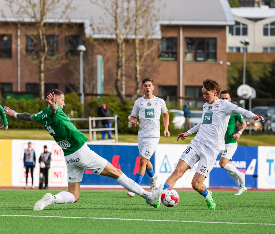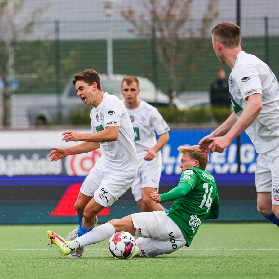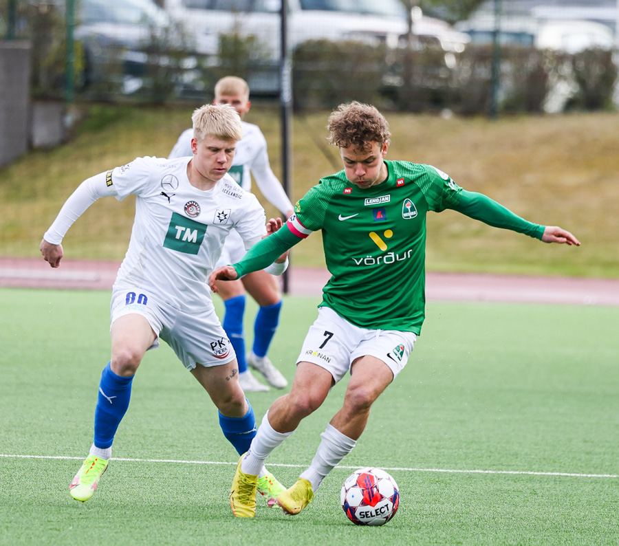 Það eru Blikar sem sparka þessu af stað. Benjamin Stokke á upphafssparkið.