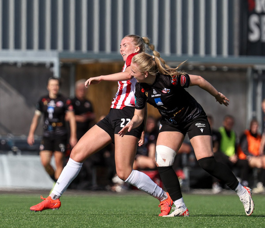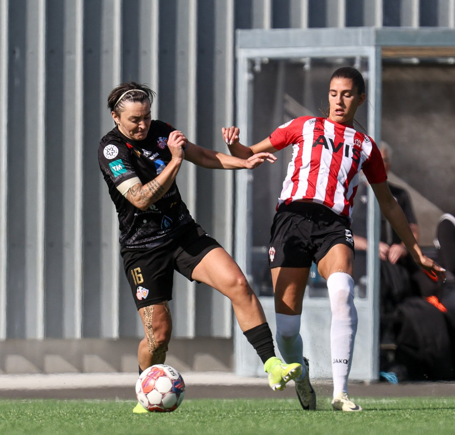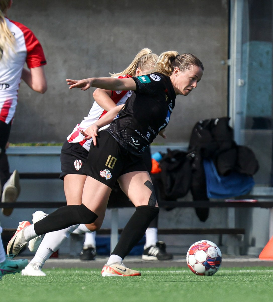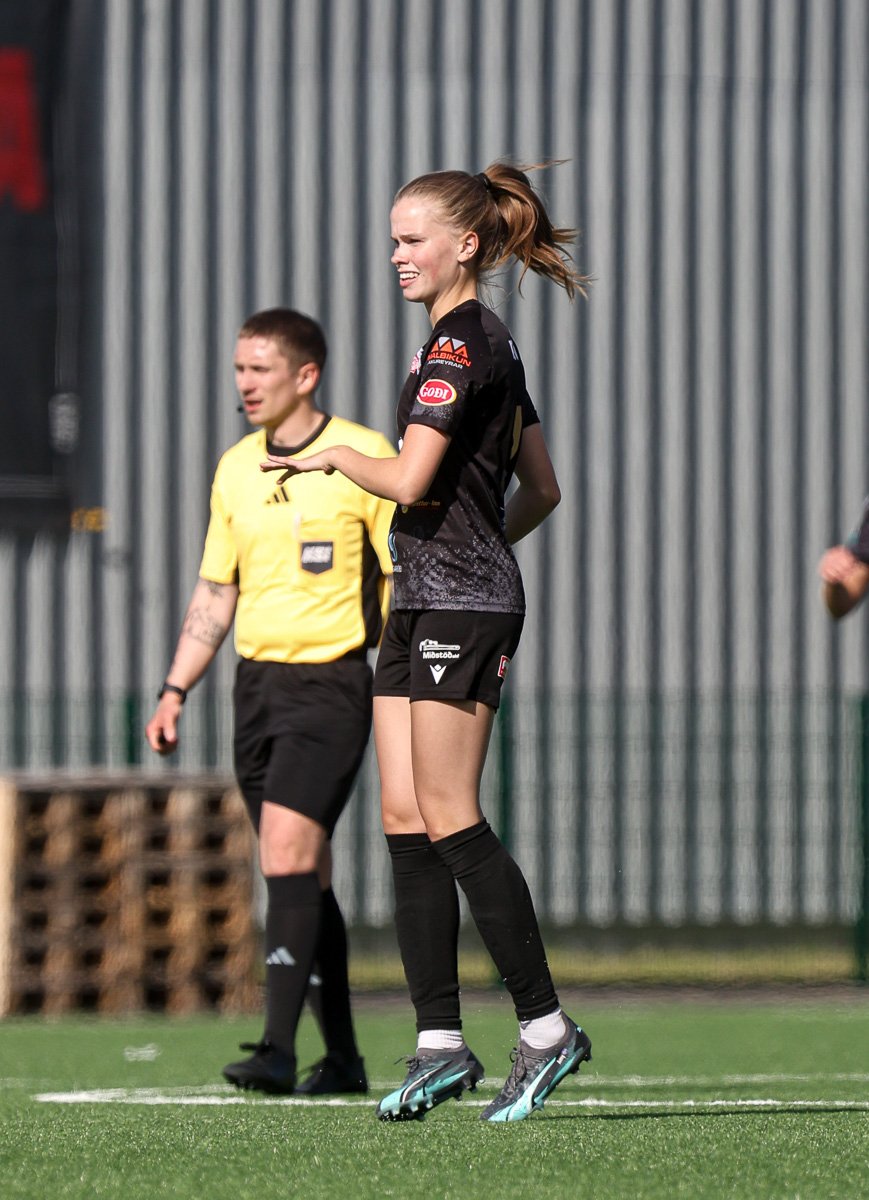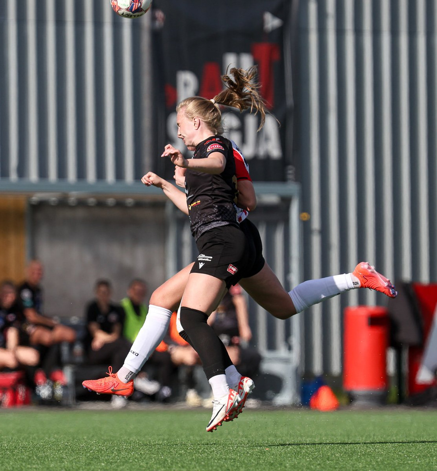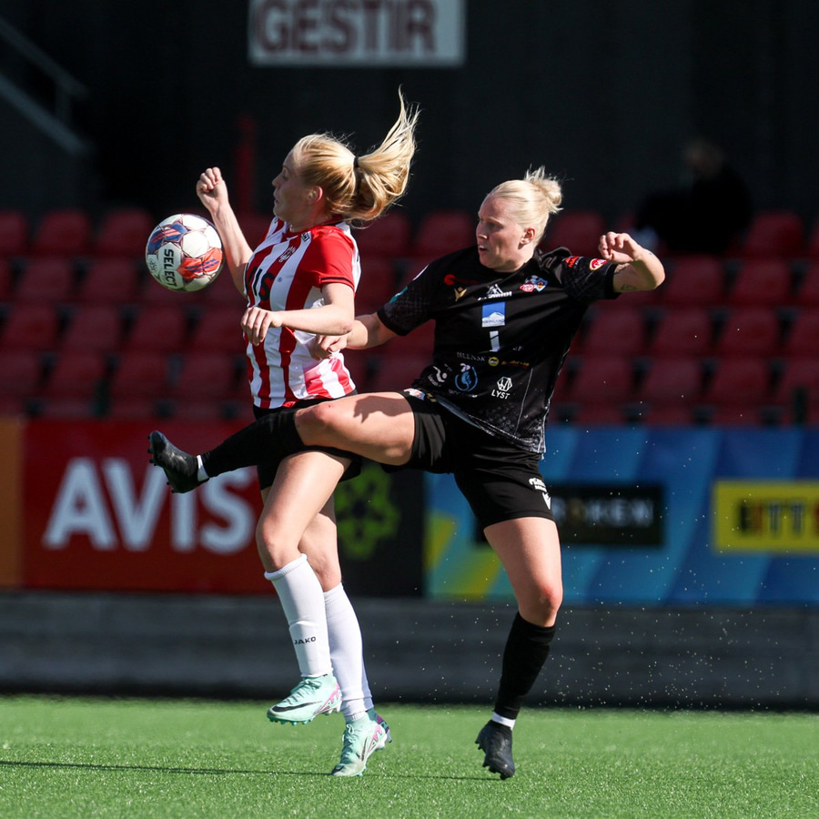 Lara Ivanusa í fínu færi í teignum eftir langa sendingu en náði ekki valdi á boltanum svo það rann út í sandinn.