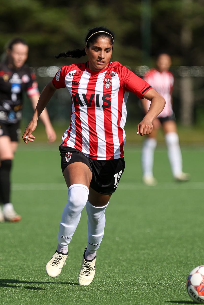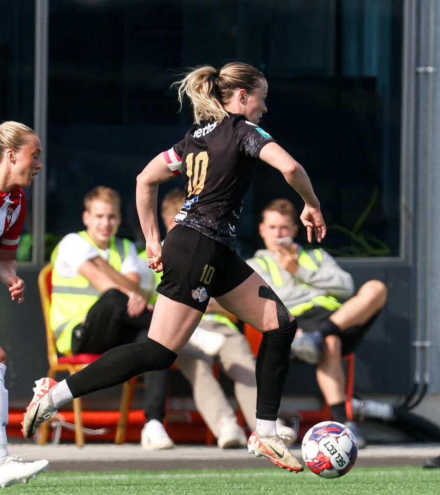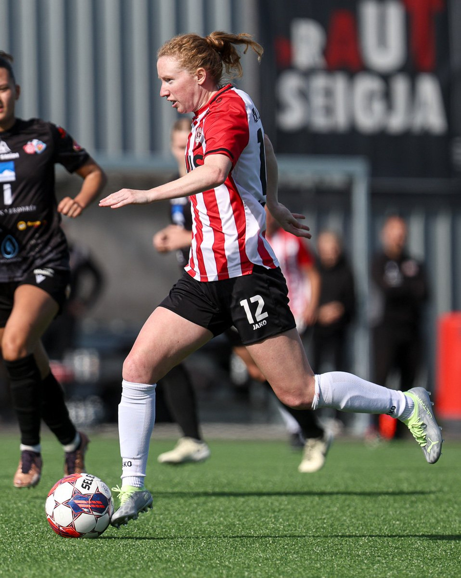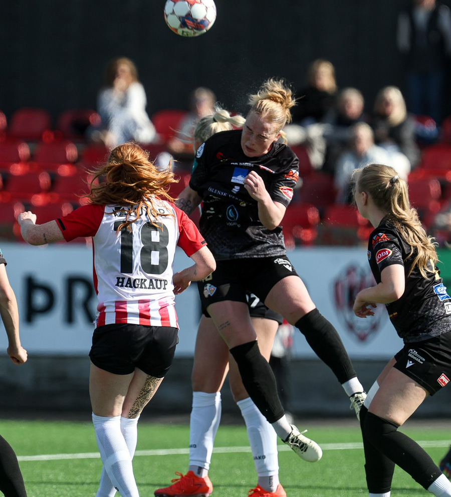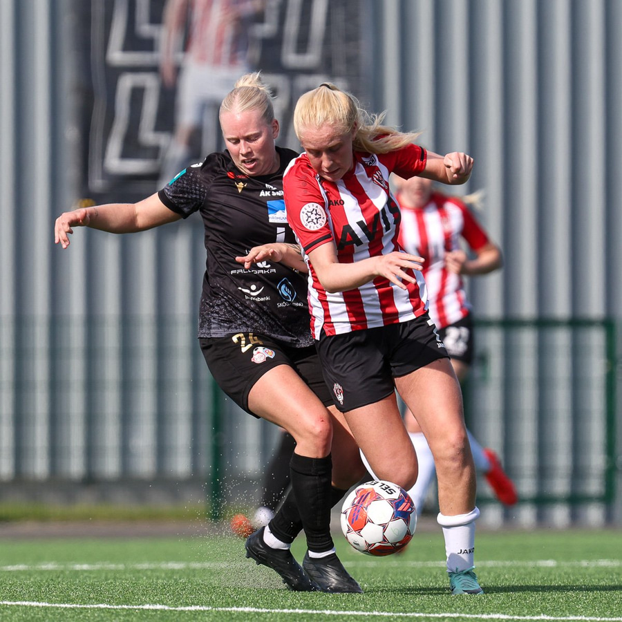 Lara Ivanusa í fínu færi í teignum eftir langa sendingu en náði ekki valdi á boltanum svo það rann út í sandinn.