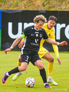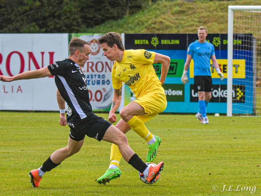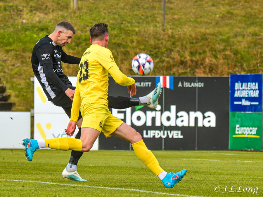 Sigurður Bjartur fær langan bolta upp völlinn og skallar hann aftur fyrir sig og skyndilega er Ísak Óli, sem er kominn upp á topp, kominn í góða stöðu. Hann tekur skotið en missir jafnvægi í skotinu og skotið fer í hliðarnetið.