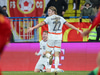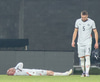 Arnór Ingvi sest á völlinn og kveinkar sér.