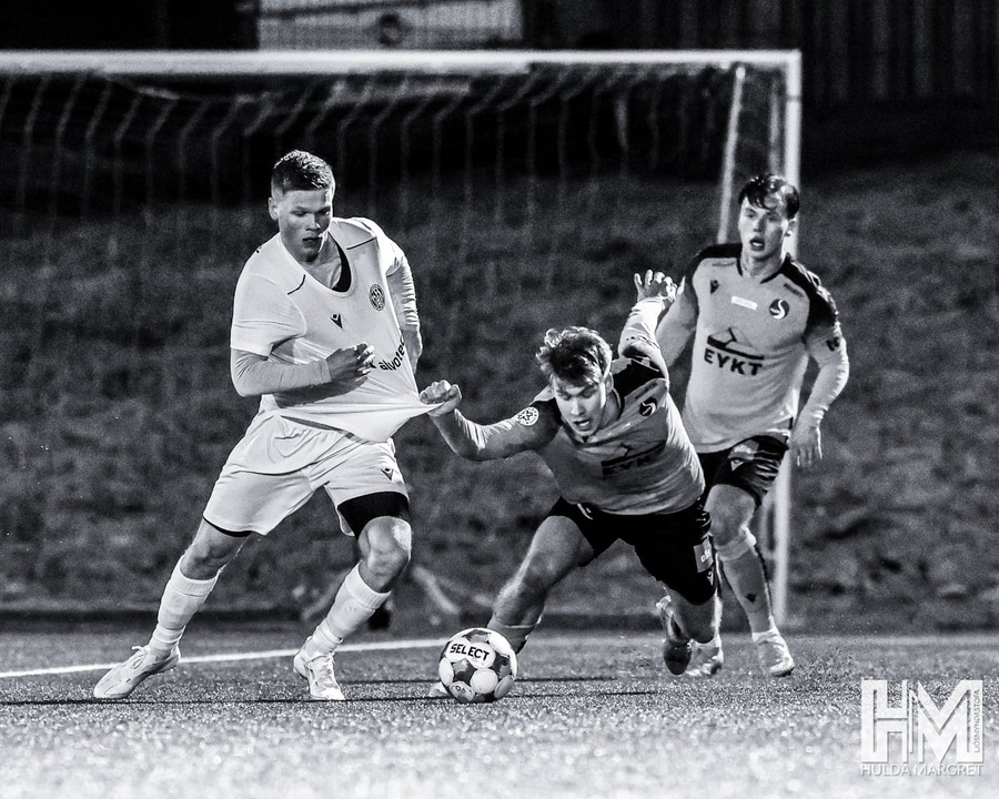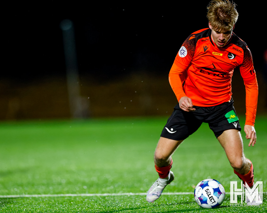 Theodór Ingi brunar upp hægri kantinn og kemur með boltann inn í teiginn. Guðmar Gauti tekur þar á móti boltanum og hefur engan nema markmanninn fyrir sér. Guðmar missir síðan eitthvað jafnvægið og dettur hreinlega þannig að Halldór getur náð í boltann.