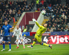 Hornspyrna frá hægri og Aron Einar fær hann í sig og boltinn rétt framhjá, þarna munaði litlu að boltinn hafi endað í eigin neti.