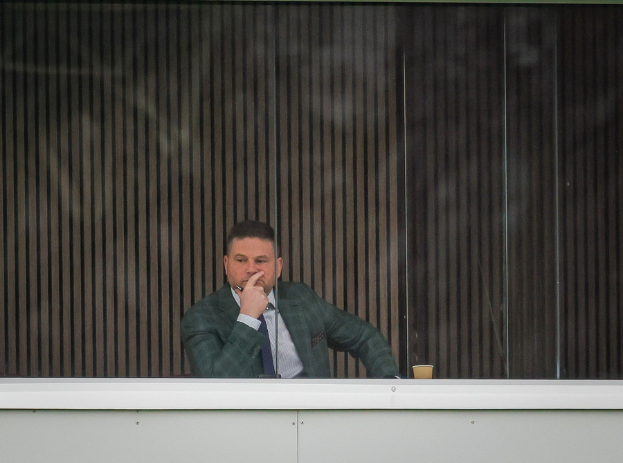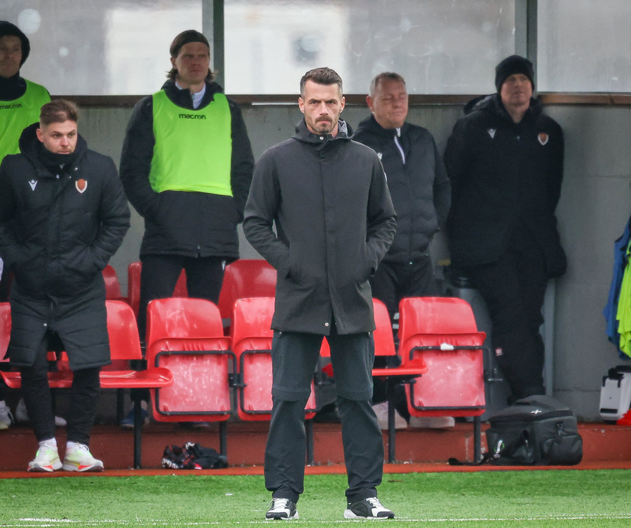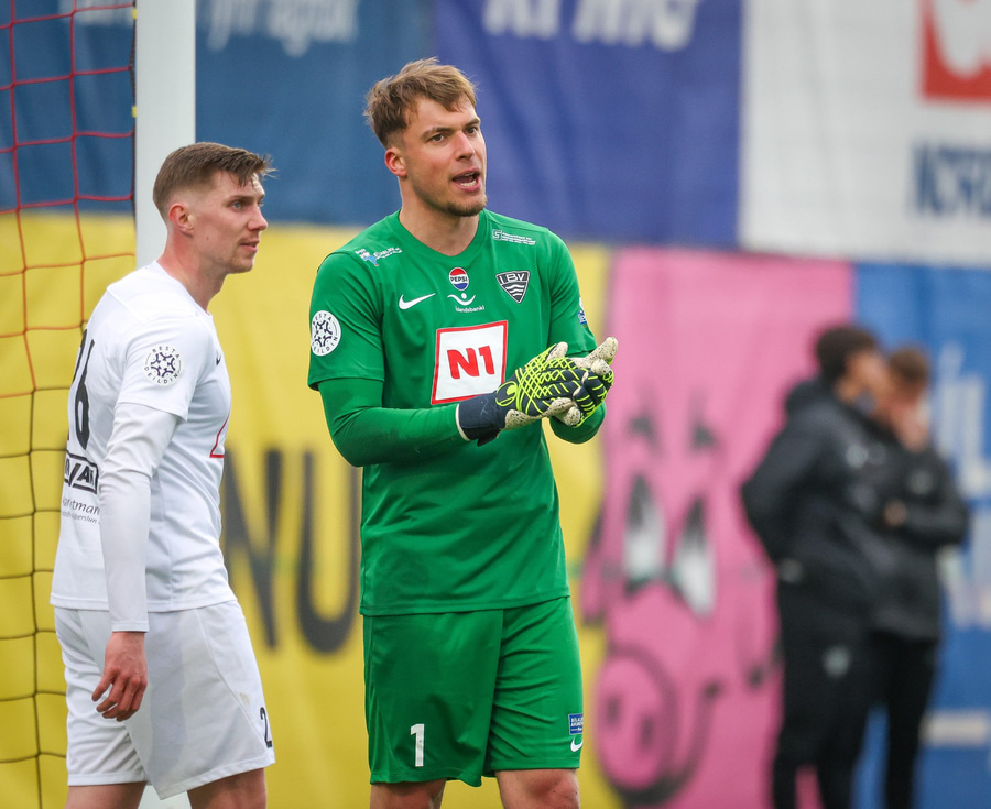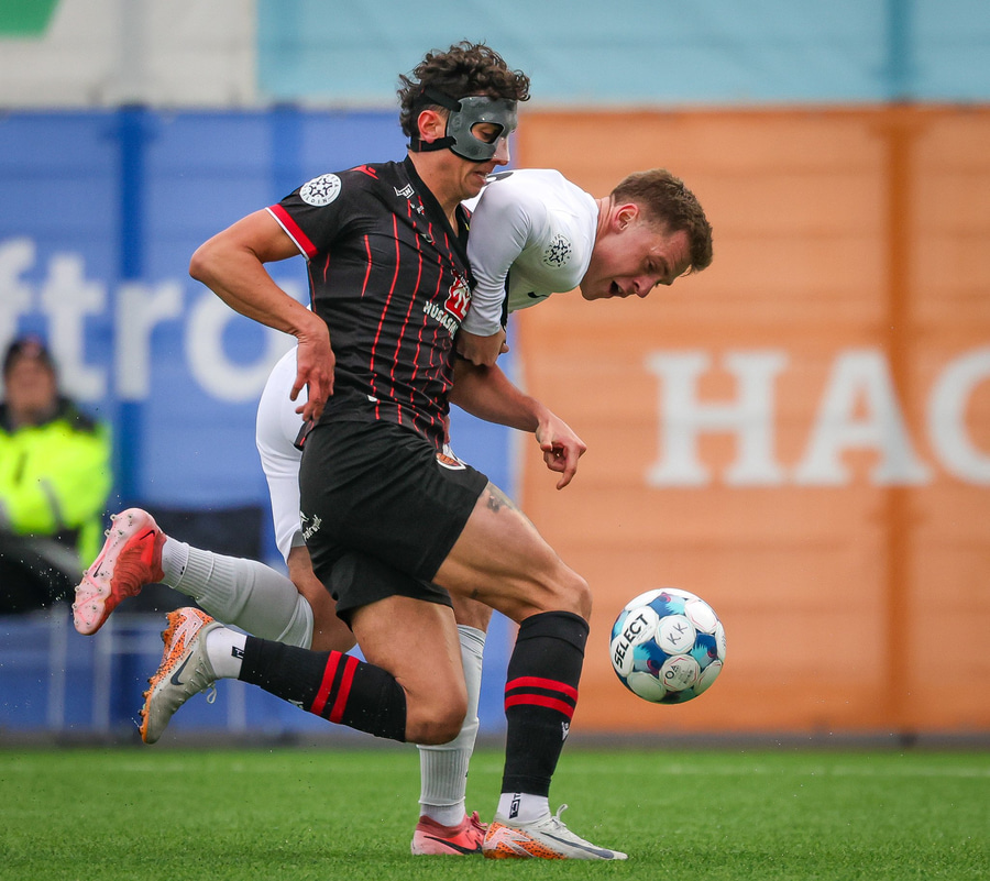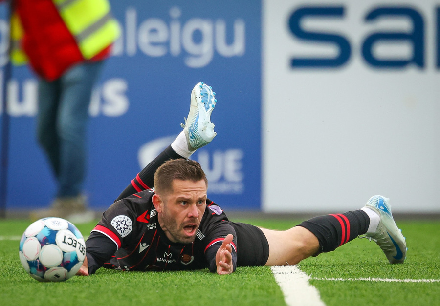 Frábær hornspyrna frá Gylfa ratar á kollinn á Gunnari Vatnhamar í teignum sem skallar boltann beint niður Upp hefst smá kraðak en boltinn að endingu í fang Marcel.
