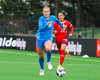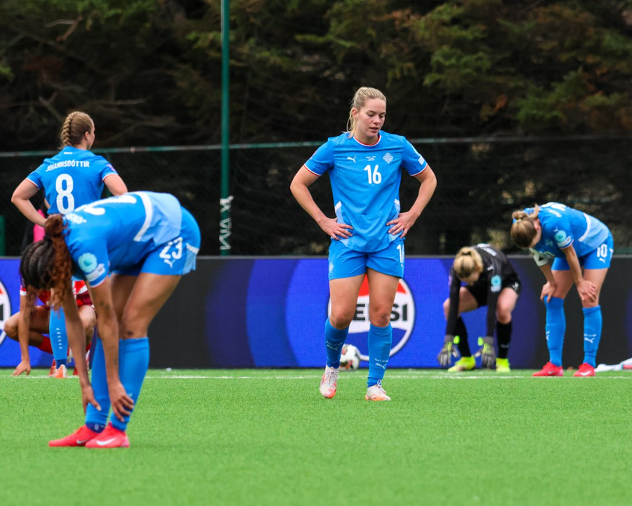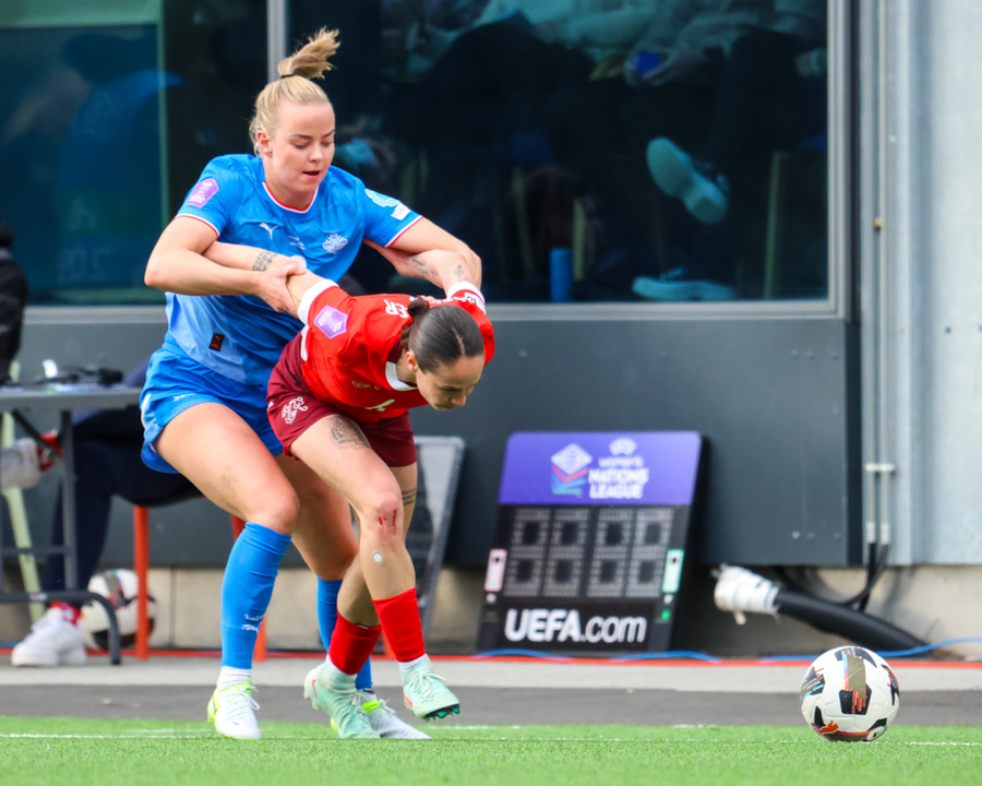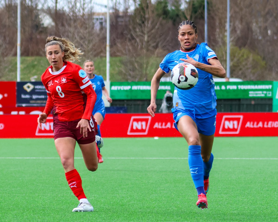 Frábært krosshlaup hjá Reuteler sprengir upp íslensku vörnina. Hún kemst fram hjá Cecilíu en þrengir færið um of sem gerir Sædísi kleift að vinna sig til baka og bjarga á marklínu.