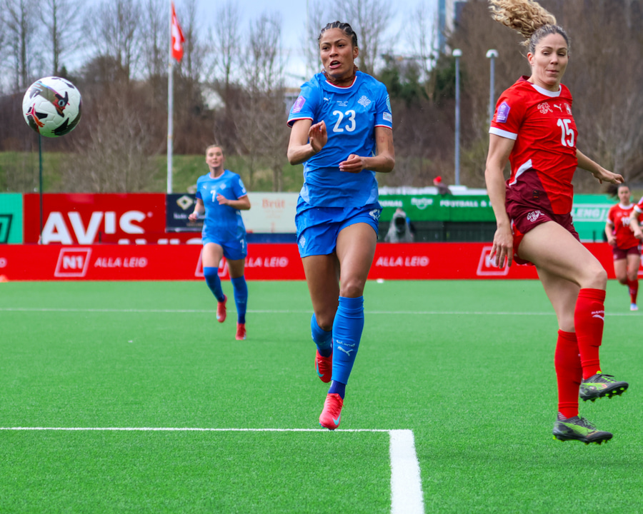 Boltanum lyft yfir vörn Sviss og Sveindís langfyrst á boltann. Í fínni stöðu nær hún skoti vinstra megin í teignum en boltinn hárfínt framhjá.