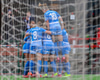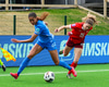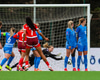 Boltinn fellur fyrir hana fyrir utan teig hægra megin. Hún lætur bara vaða og Elvira í markinu alls ekki með þetta á hreinu. Slær boltann beint upp og er hársbreidd frá því að missa hann inn fyrir marklínuna.
