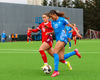 Boltanum lyft inn á teiginn. Guðrún með sóknarmann í bakinu gerir vel og skallar í horn. Líklega brotið á henni en ekkert dæmt.