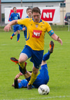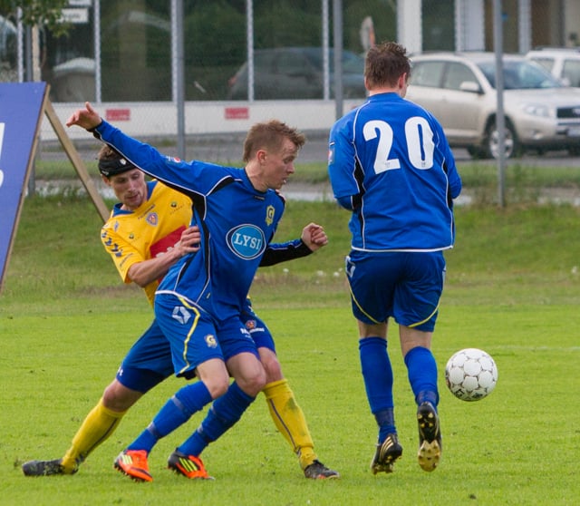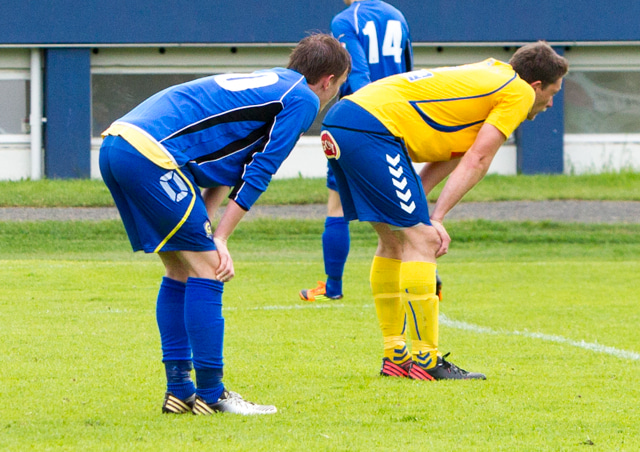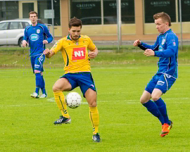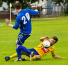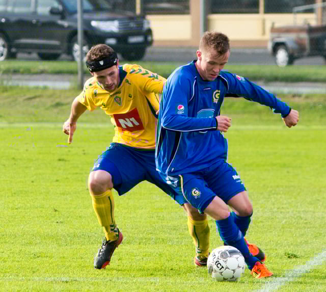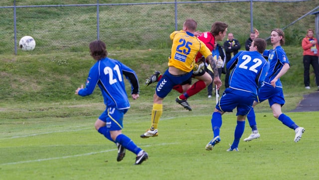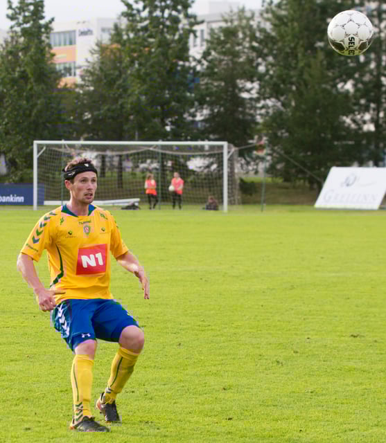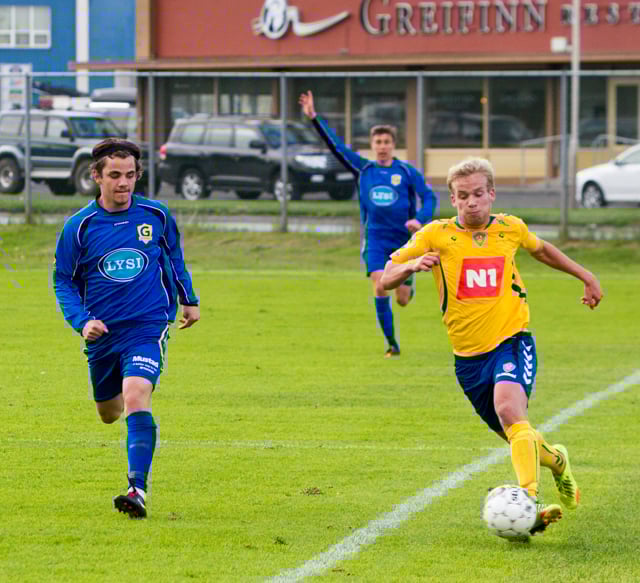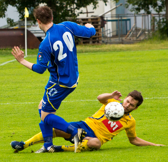 Atli Sveinn dæmdur brotlegur þegar Óli Baldur Bjarnason fellur rétt fyrir utan vítateig. Óli sá alfarið um þetta sjálfur en Guðmundur Ársæll sá það ekki. Daníel Léo tekur spyrnuna en skotið fer yfir markið.