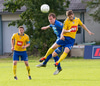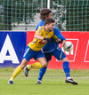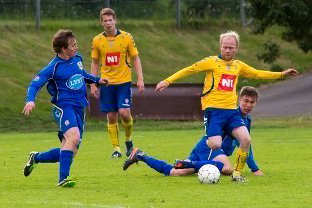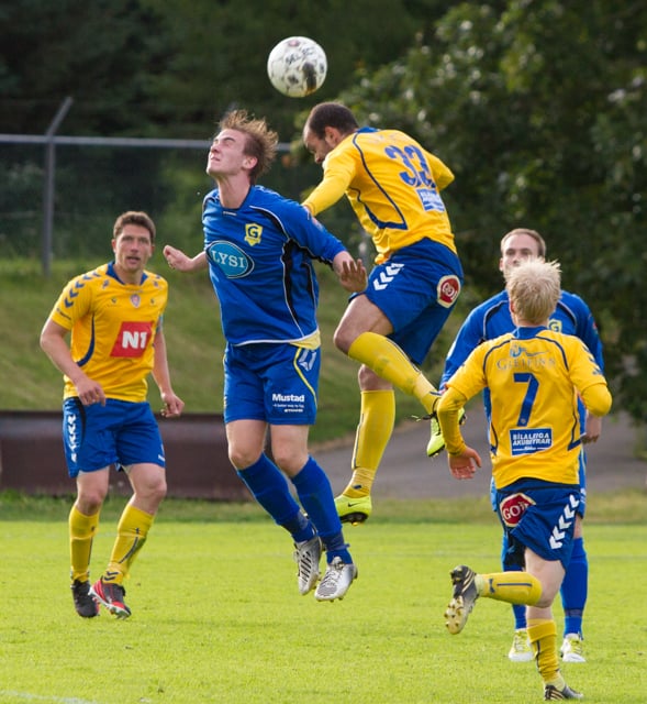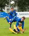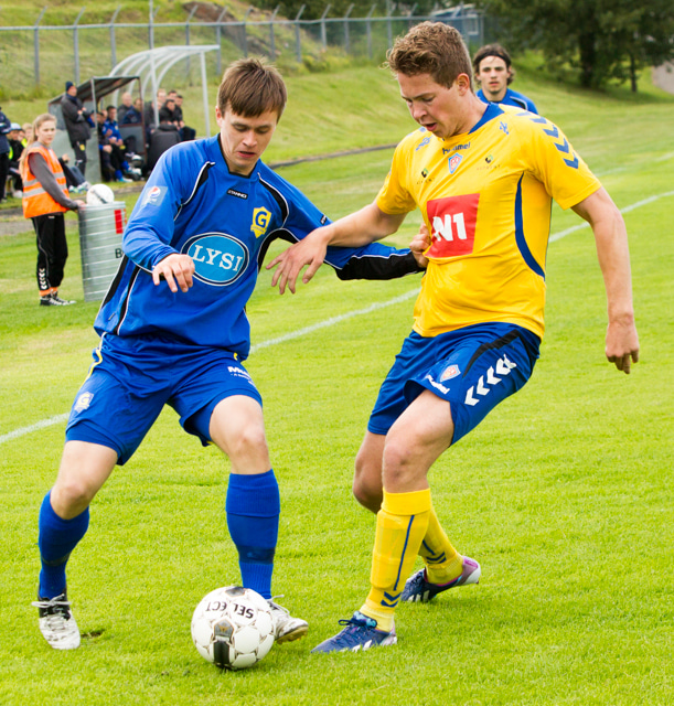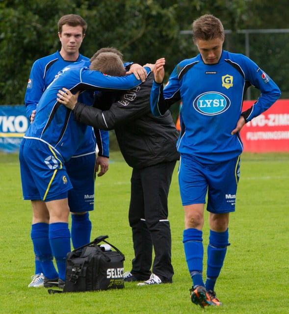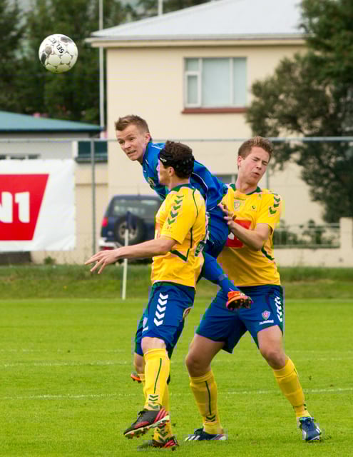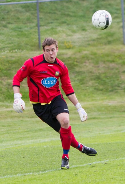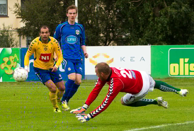 Langur bolti fram sem Atli Sveinn skallar áfram á Carsten sem nær að pota boltanum framhjá Óskari í markinu.