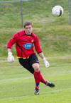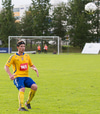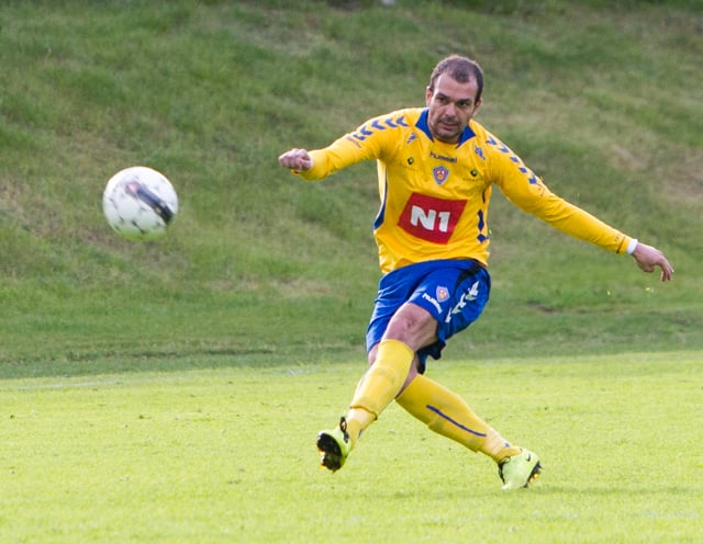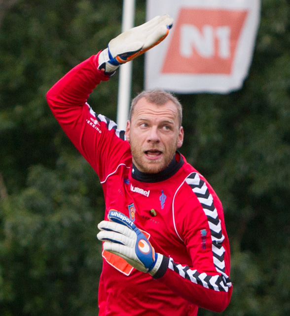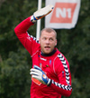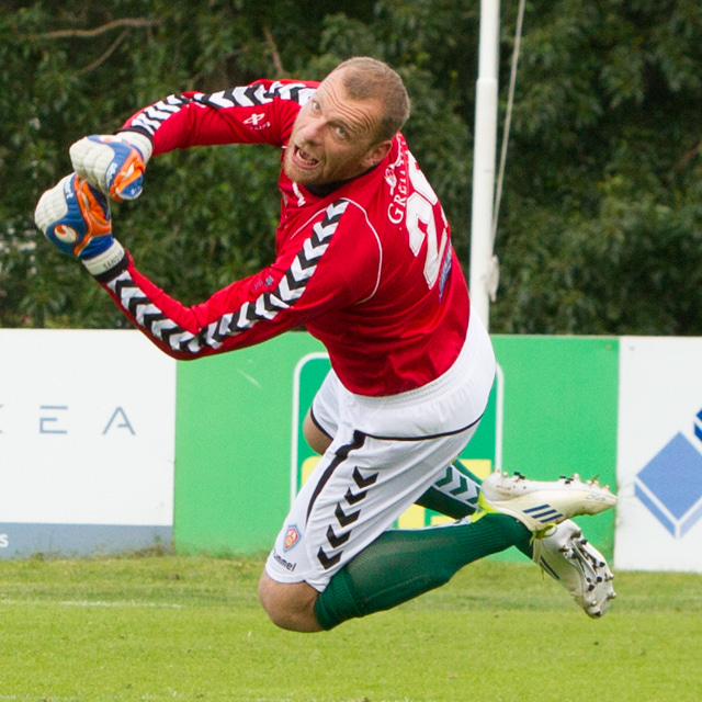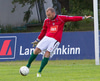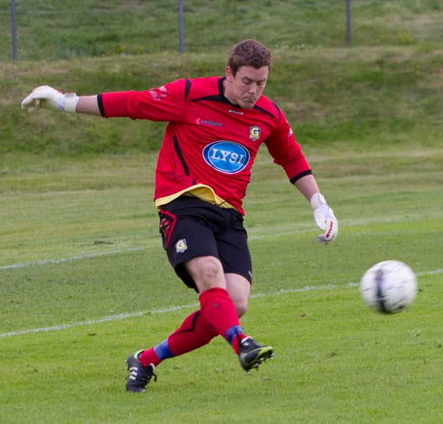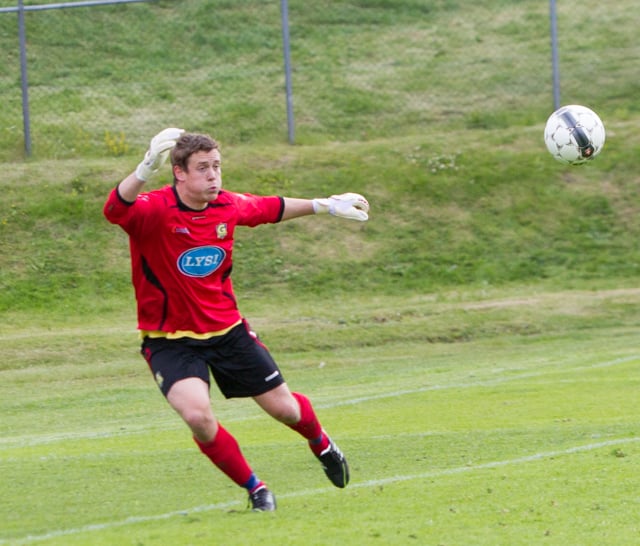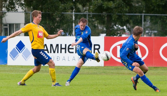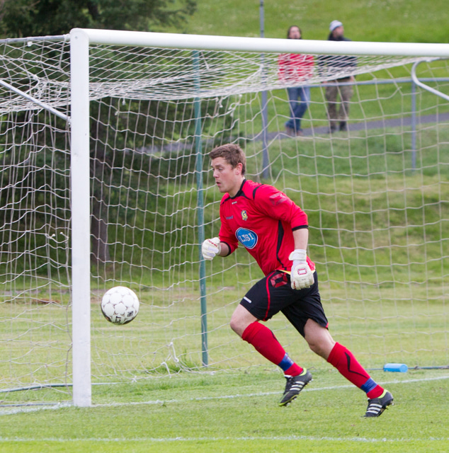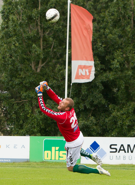 Jóhann Helgason með skot rétt fyrir utan teig sem Sandor ver vel, markmennirnir eru heitir hér í dag.