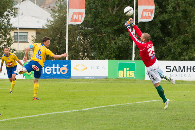 Vá... Hvernig endaði boltinn ekki í netinu?? Stefán Þór Pálsson sleppur í gegn eftir laglega stundusendingu, nær fínu skoti en Sandor ver vel. Svo koma þrjú skot í viðbót öll í röð sem varnarmenn KA ná að komast fyrir.
