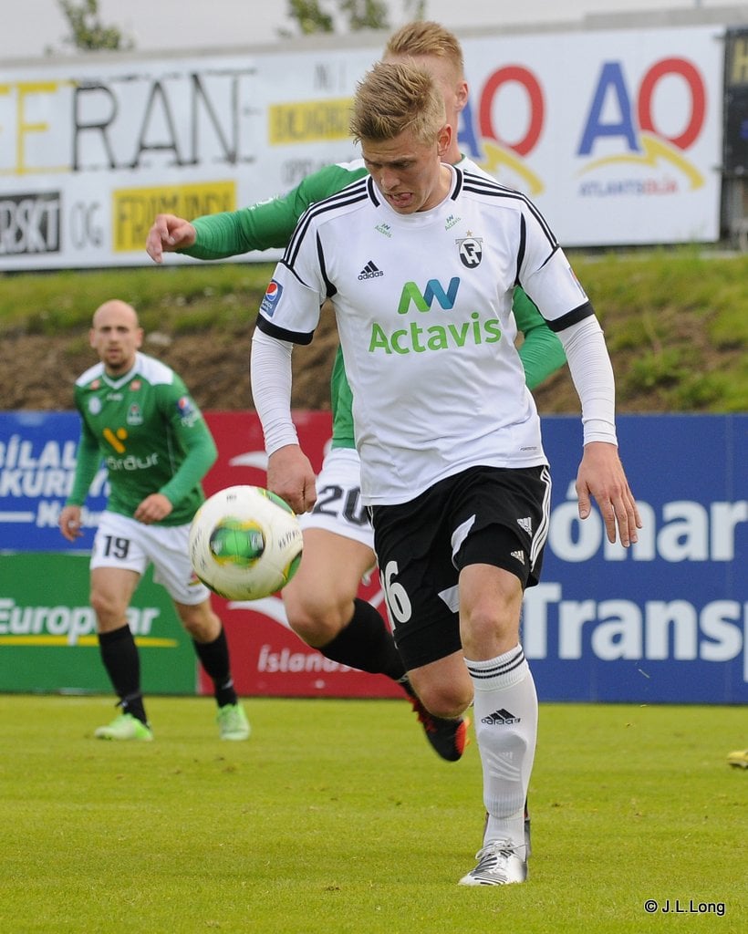 Finnur Orri nálægt því að skora. Laus bolti datt fyrir framan hann rétt fyrir utan teig, skotið fór í varnarmann og snerist naumlega framhjá marki FH-inga.