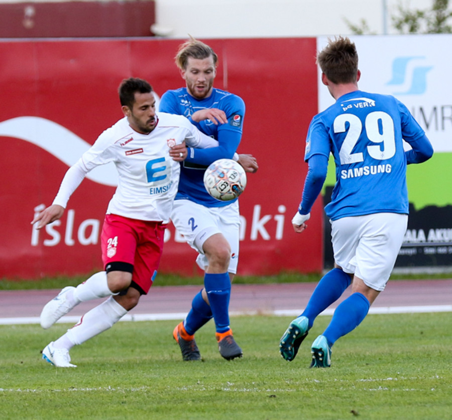 Þórsarar fá hér aukaspyrnu á hægri kantinum, Aron með lúmska spyrnu sem skoppar í teignum í gegnum miðjan pakkann og aftur fyrir. Þarna hefði bara þurft stóru tánna í boltann!