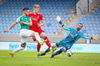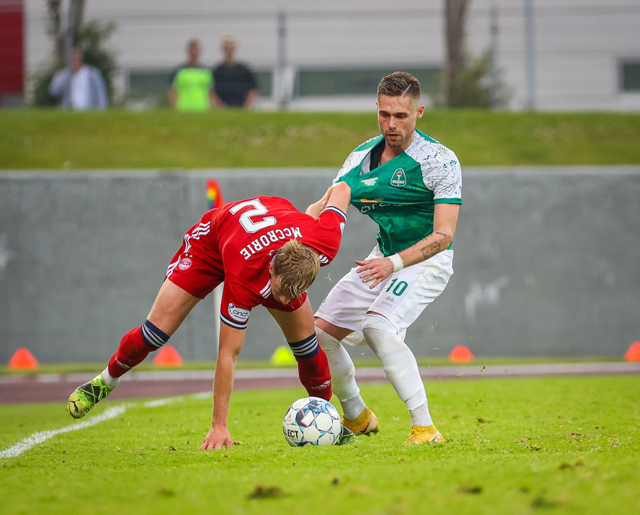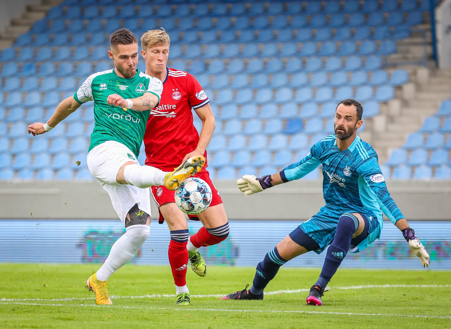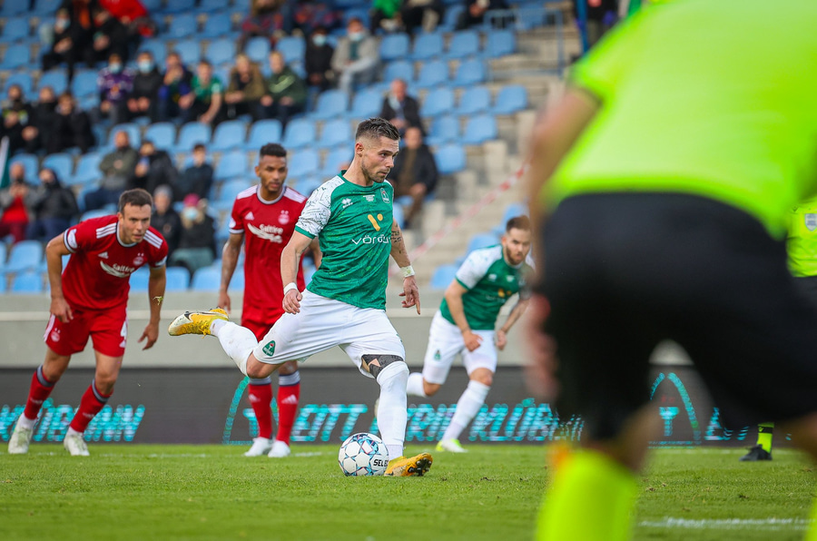 Aberdeen taka aukaspyrnu snöggt en Viktor Örn vel á verði og bjargar því að Aberdeen komist í dauðafæri.