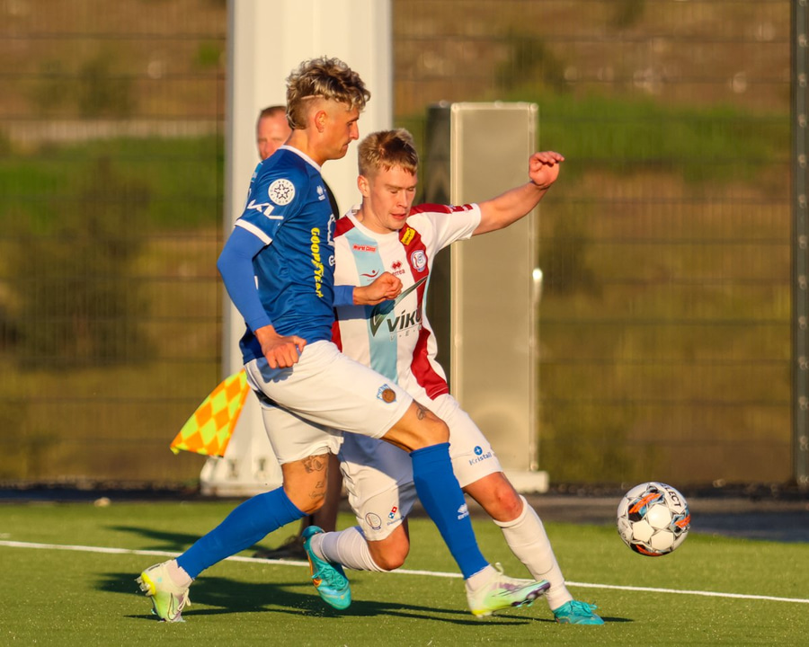 Tiago og Albert vinna sig virkilega vel upp völlin með þríhyrningaspili en þegar Tiago er komin inn á teig þá er hann alltof lengi að hugsa og endar á að gefa boltan á Tryggva sem tekur skotið beint á Viktor.