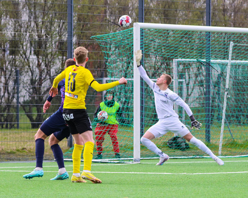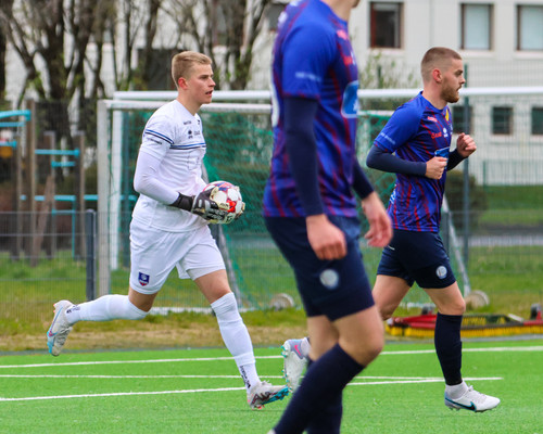 Daníel Ingi með sendingu á Steinar sem tekur skotið en Viktor ver af öryggi.