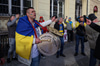 Úkraínumenn með þjóðfána sinn yfir axlirnar. Við erum bláir í kvöld, þeir gulir. Hefðbundið. Þjóðsöngvarnir næst.