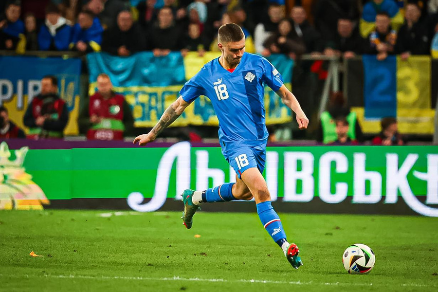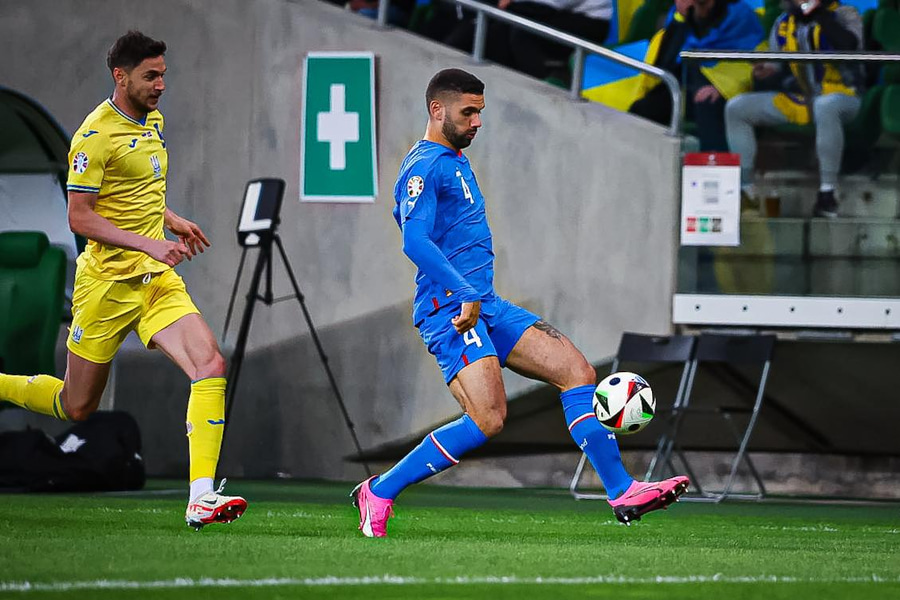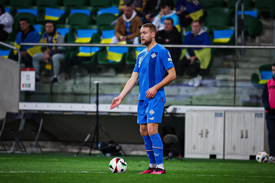 Mudryk fer framhjá Guðlaugi Victori og á fyrirgjöf sem Daníel Leó kemur í burtu. Úkraína heldur áfram að einoka boltann og fær aukaspyrnu með fyrirgjafarmöguleika frá vinstri.