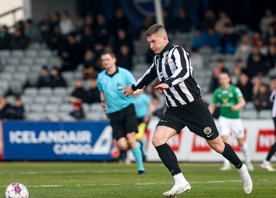 Benoný setur boltann í hægra hornið séð frá honum. Gott víti.