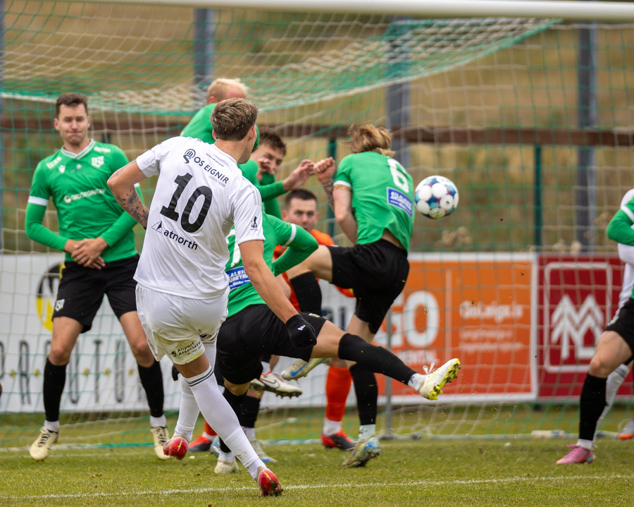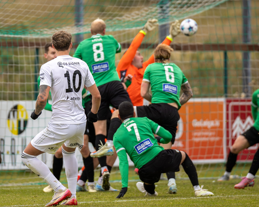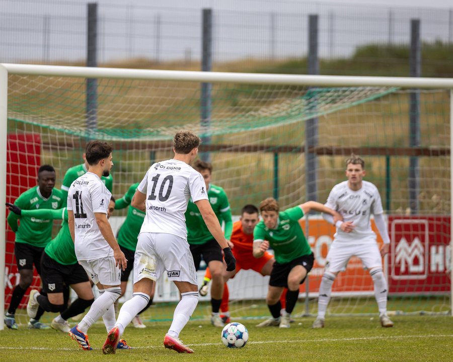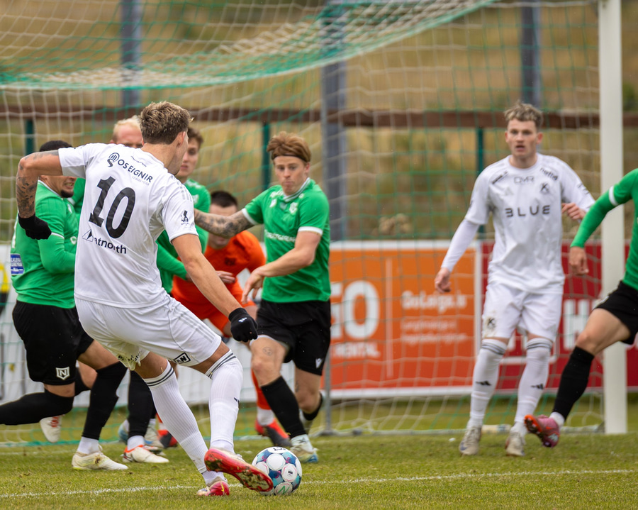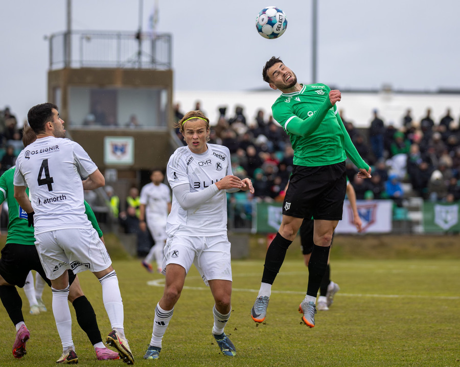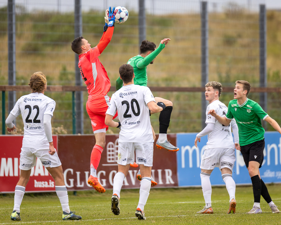 Boltinn fyrir markið en skallinn frá Valdimar beint á Sindra.